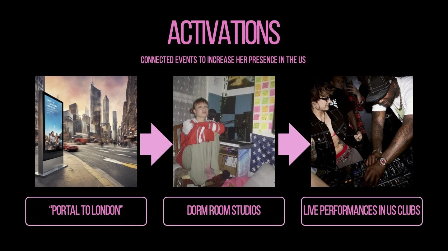 Here are key snippets from a marketing deck I designed to boost UK artist Ledbyher's presence in the U.S. My strategy included developing strategic activations, designing her website and merchandise, and more. This project was a blueprint for her successful expansion.