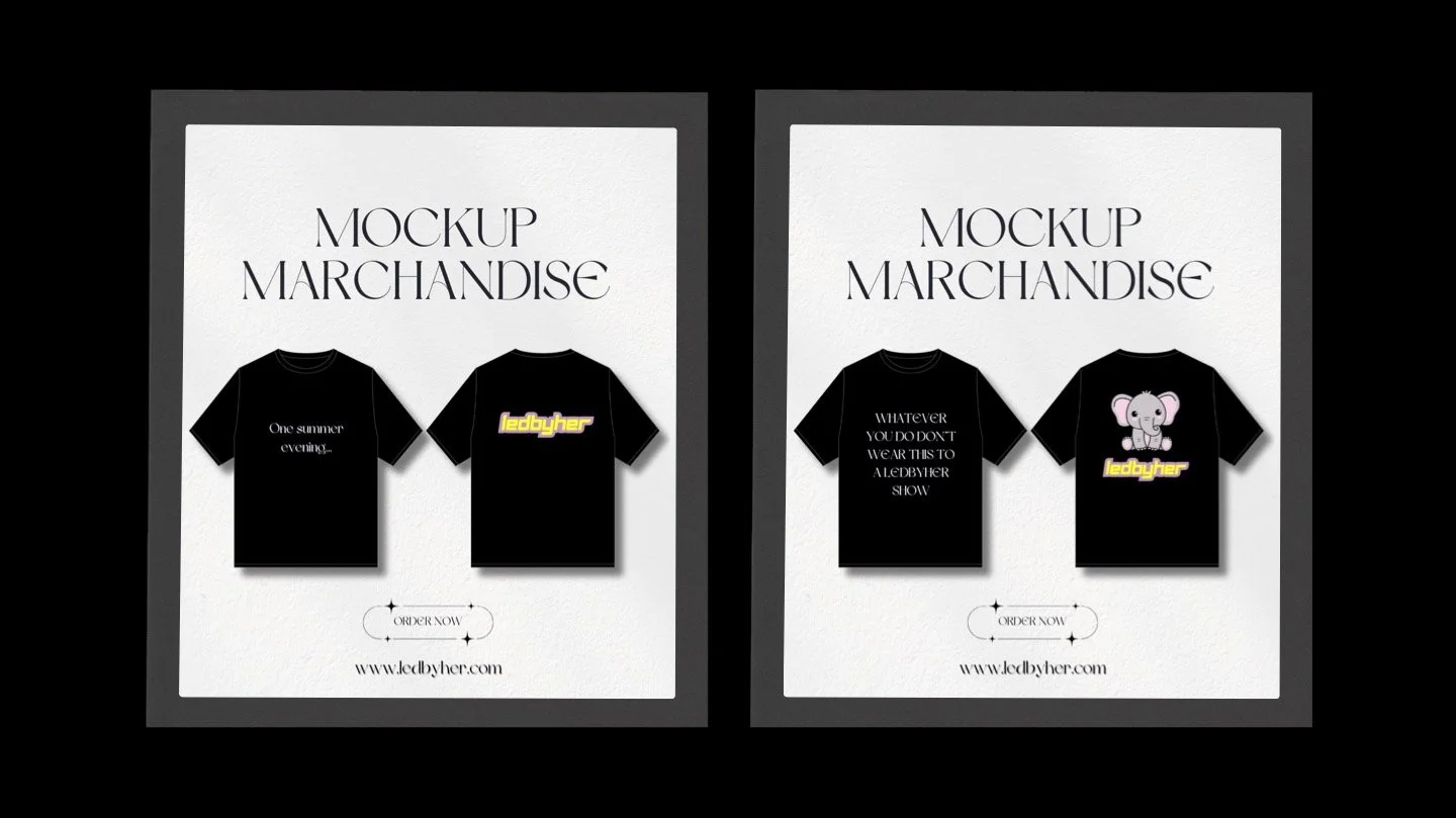 Merch on the right is a play on the pink elephant paradox, a psychological concept that the more you try to put something out your head, the more likely you are to remember it. The front says “whatever you do, don’t wear this to a Ledbyher show.” The back has a pink elephant and her logo. This idea was inspired by her love of the color pink, her referring to herself as “the elephant,” and knowledge of these concept through my Psychology studies.
